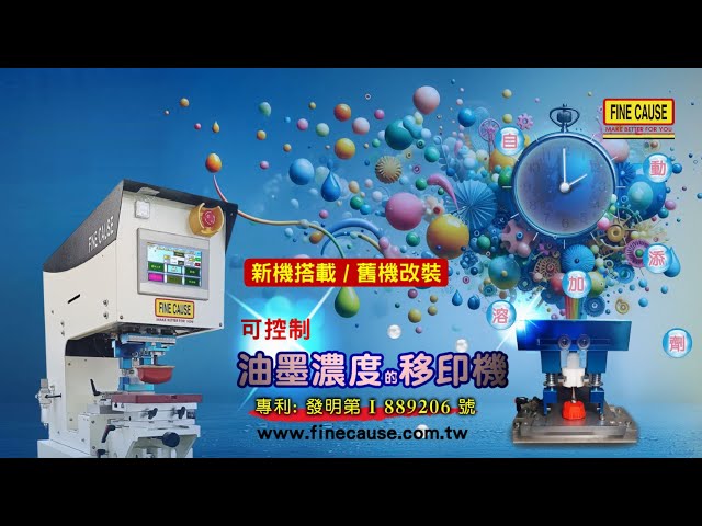 可控制油墨濃度的移印機-自動添加溶劑系統,智慧生產・油墨穩定・品質升級。台灣發明專利:發明專利第I889206號,新機搭載、佳因舊機改裝皆可。多次少量添加,穩定油墨濃度長達24小時,依照印刷次數自動添加,避免濃稠或乾墨現象,無需停機添加溶劑,不影響產線連續性,提高稼動率與良率。